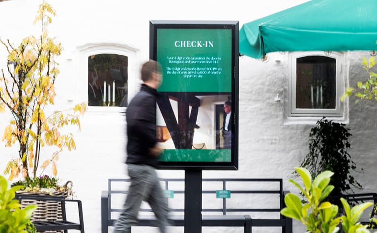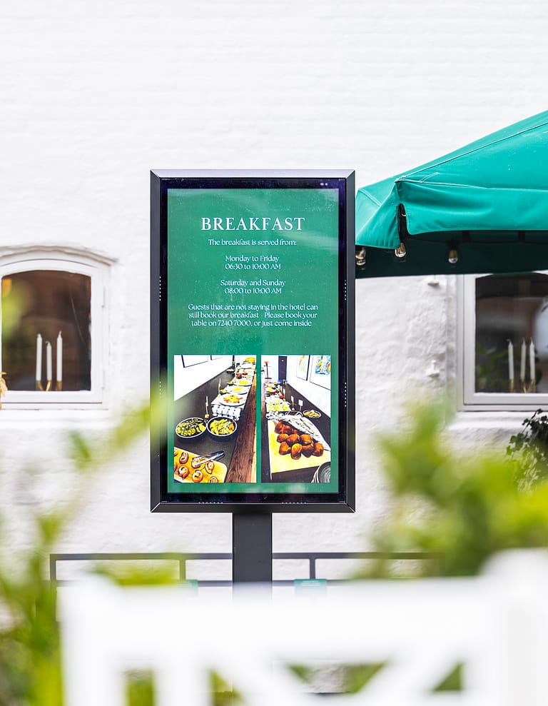 Med en lysstyrke på imponerende 4.000 nits er dette markedets stærkeste løsning, der sikrer perfekt læsbarhed både indendørs og udendørs – selv bag glasfacader eller i solrige indgangspartier.